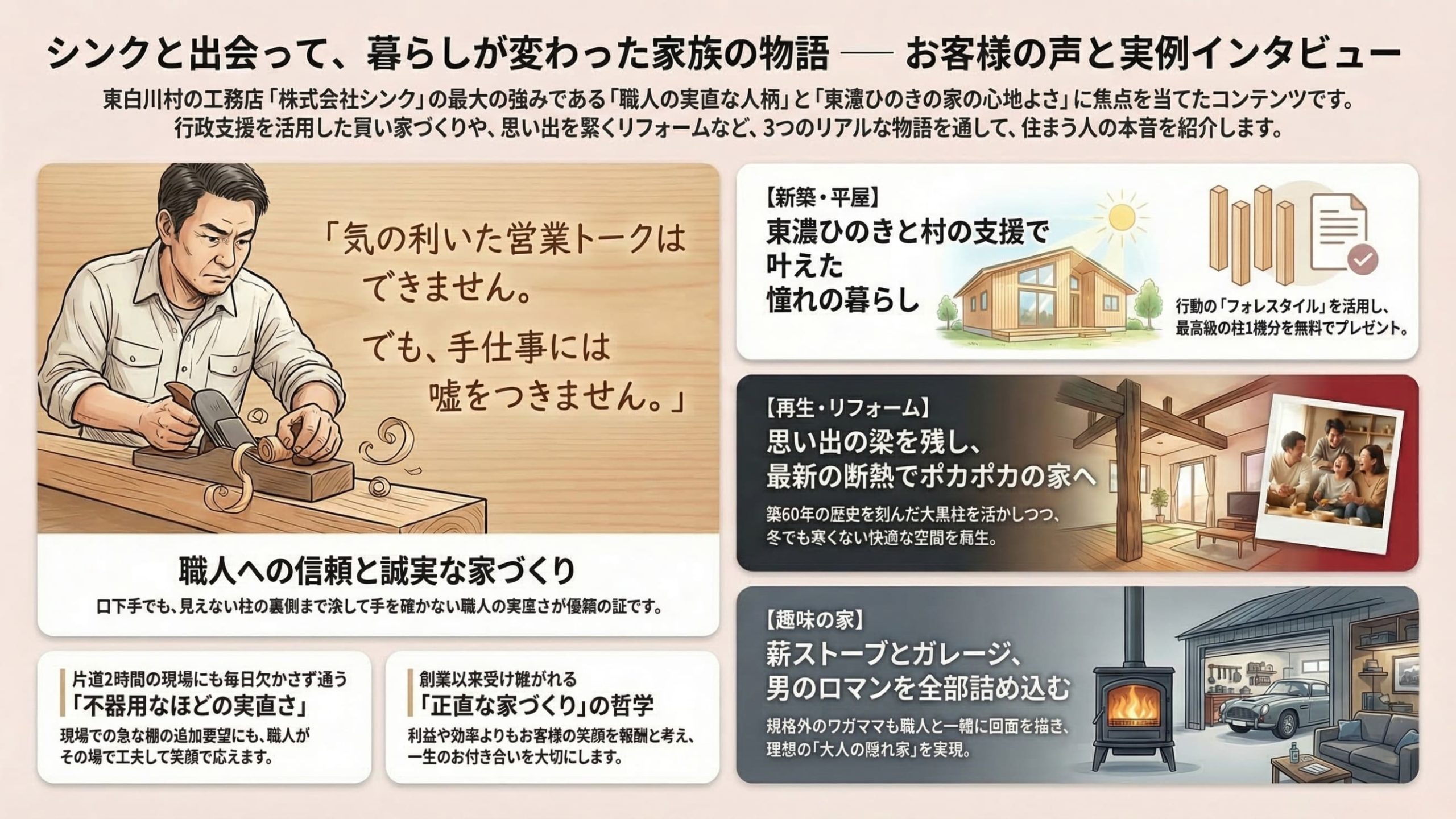 「現場で『ここに棚を追加できる?』と聞いたら、嫌な顔ひとつせずその場で工夫してくれた」「田舎の職人さんの素朴で親身な対応に、心から信頼してお任せできた」。