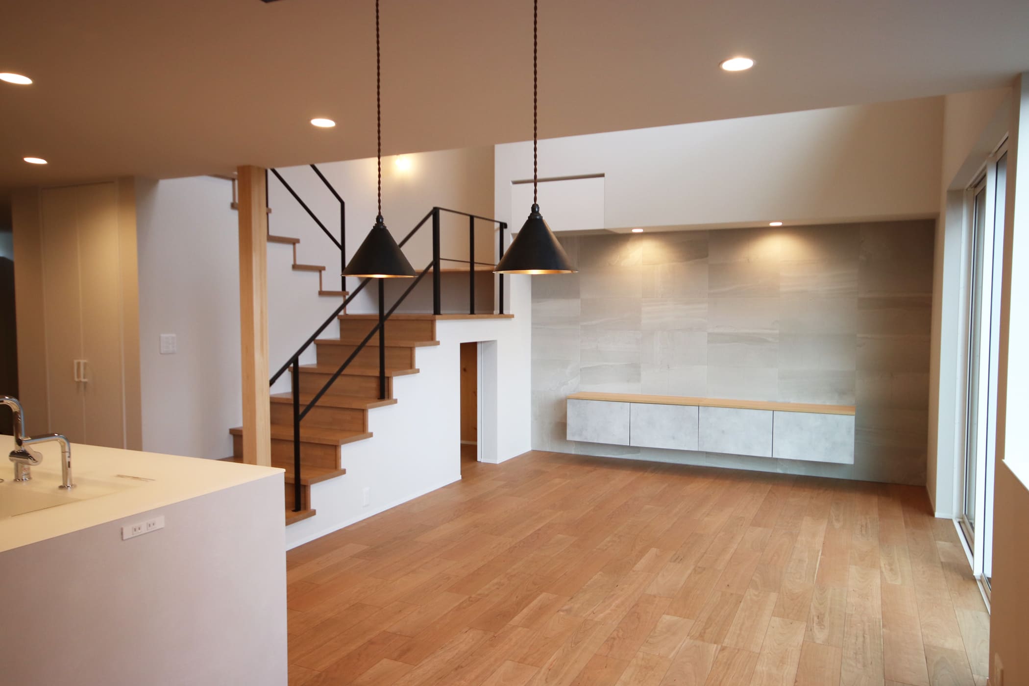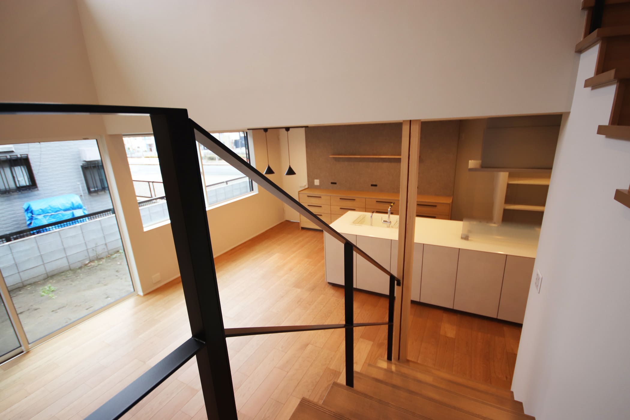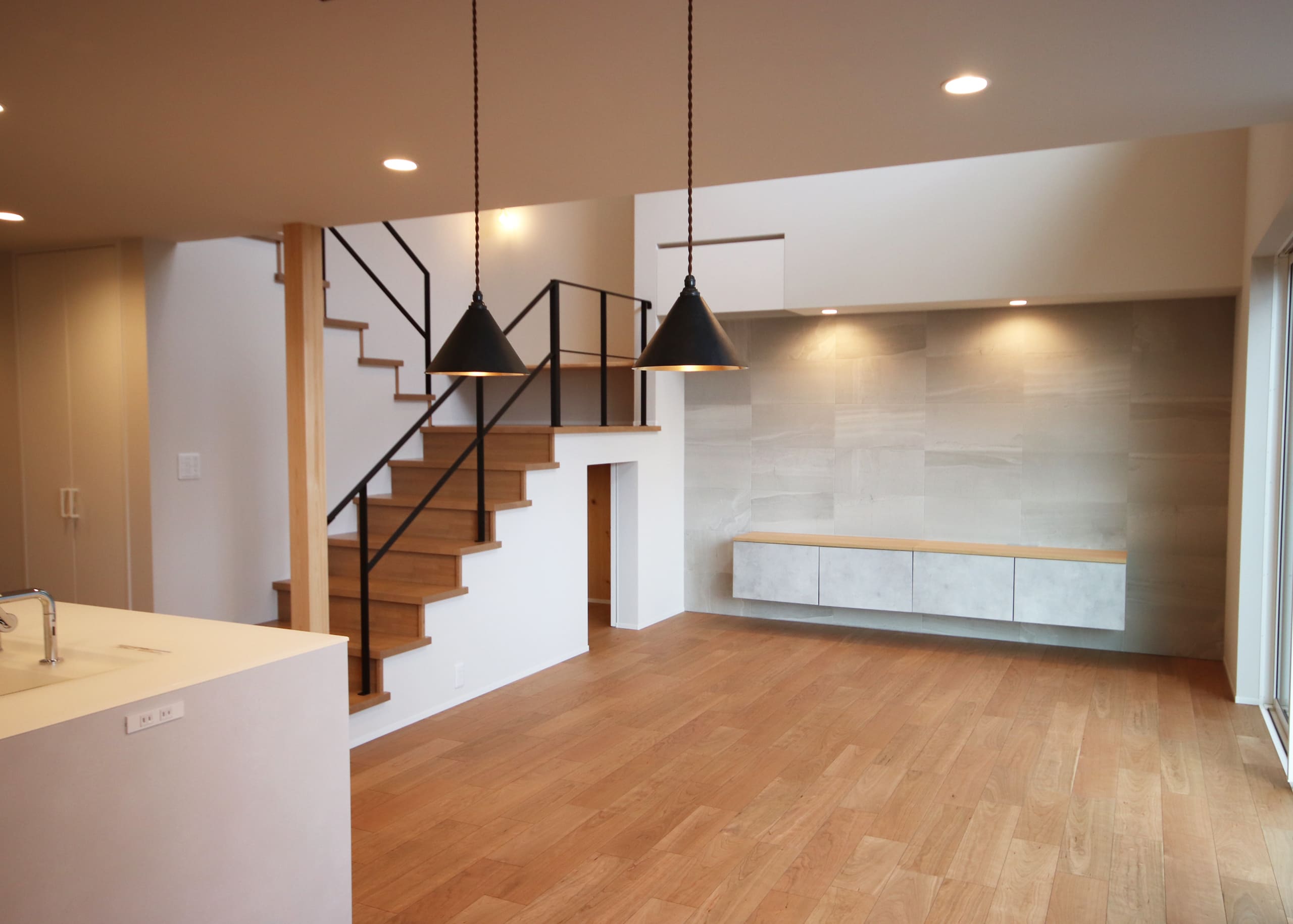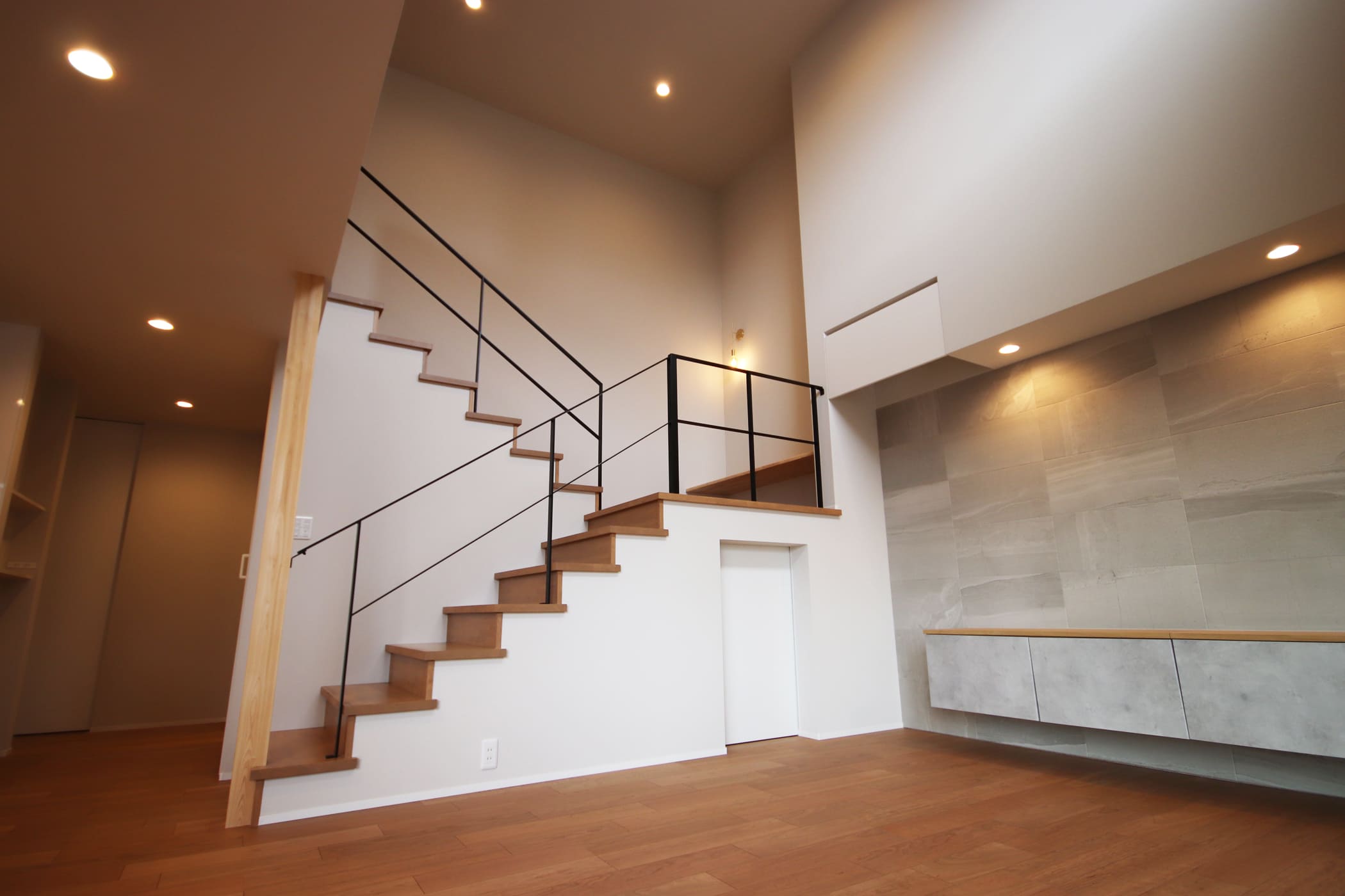 リビングに入ってまず目を奪われるのは、空間のシンボルとなる美しい木の柱と、抜け感のあるアイアン階段。