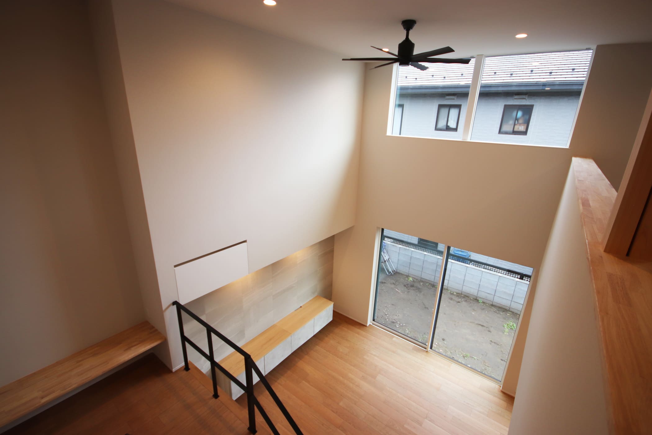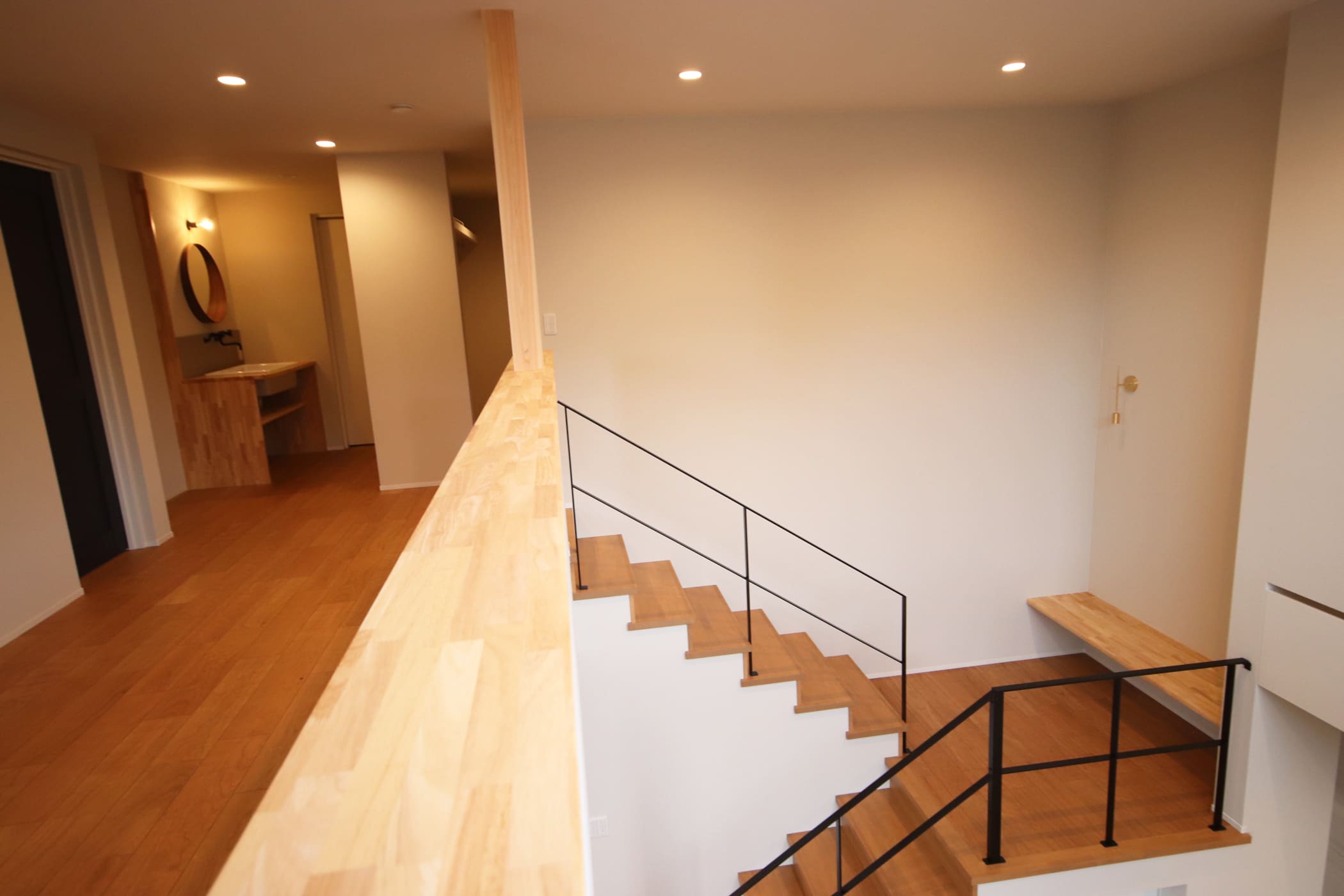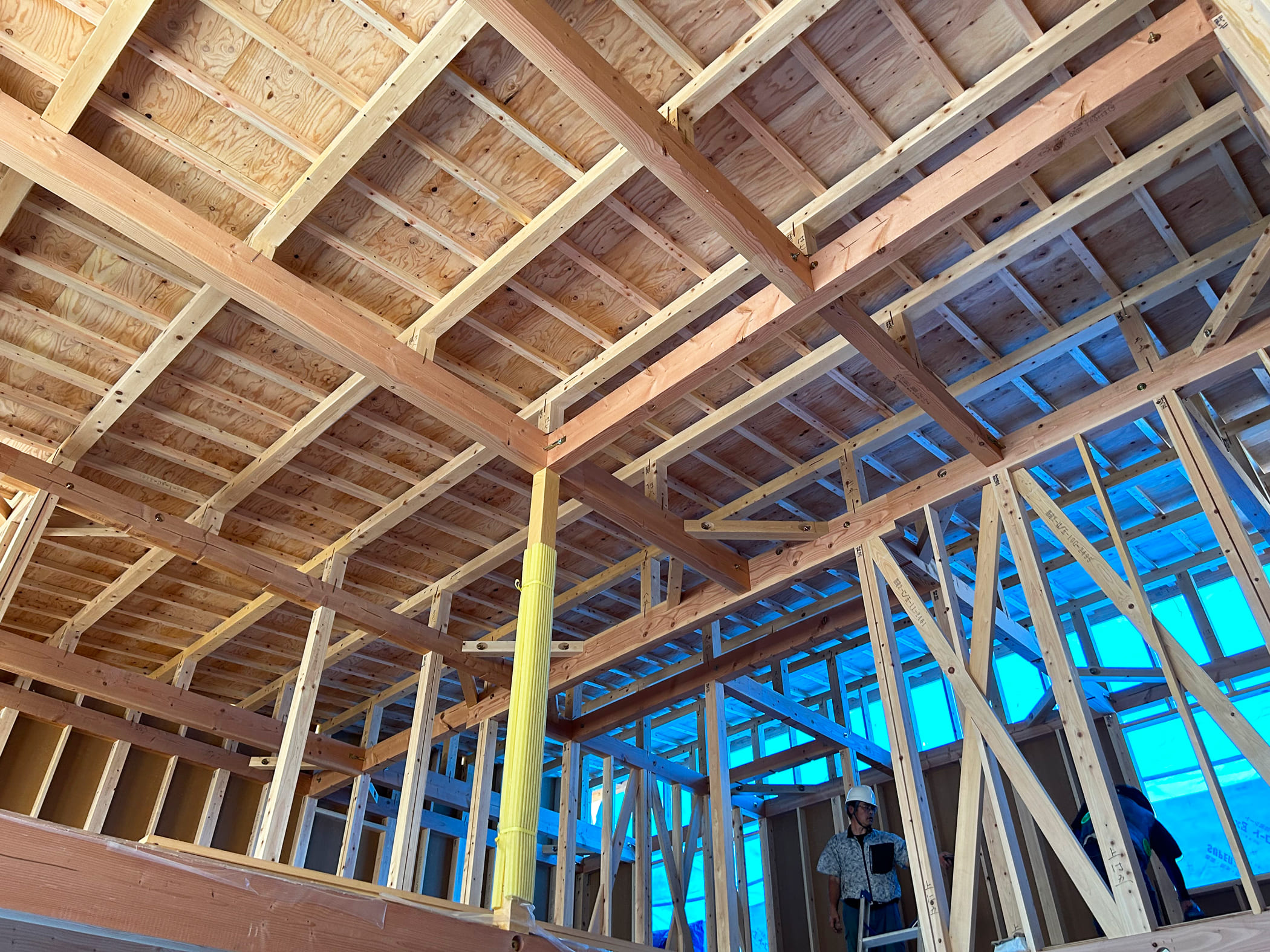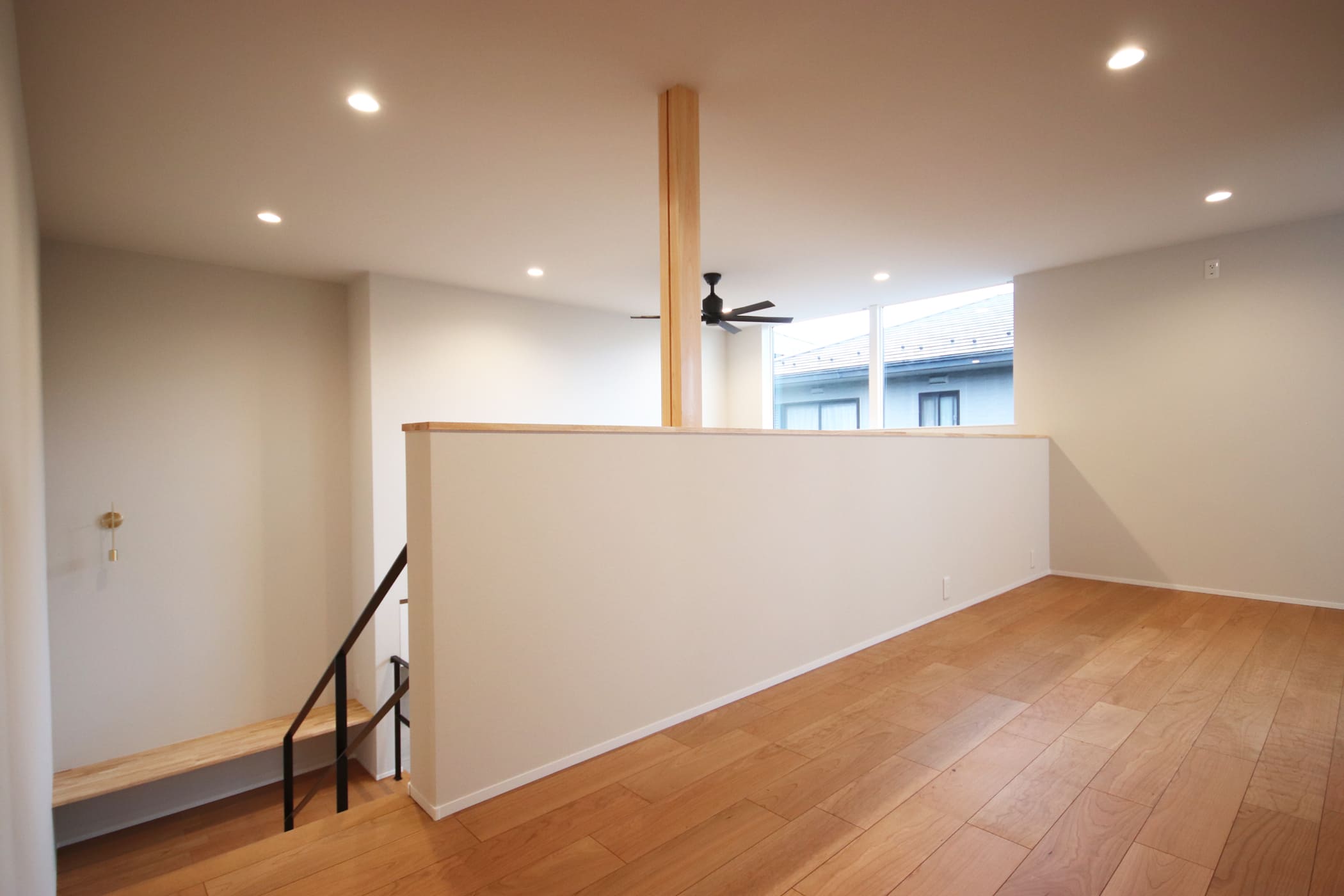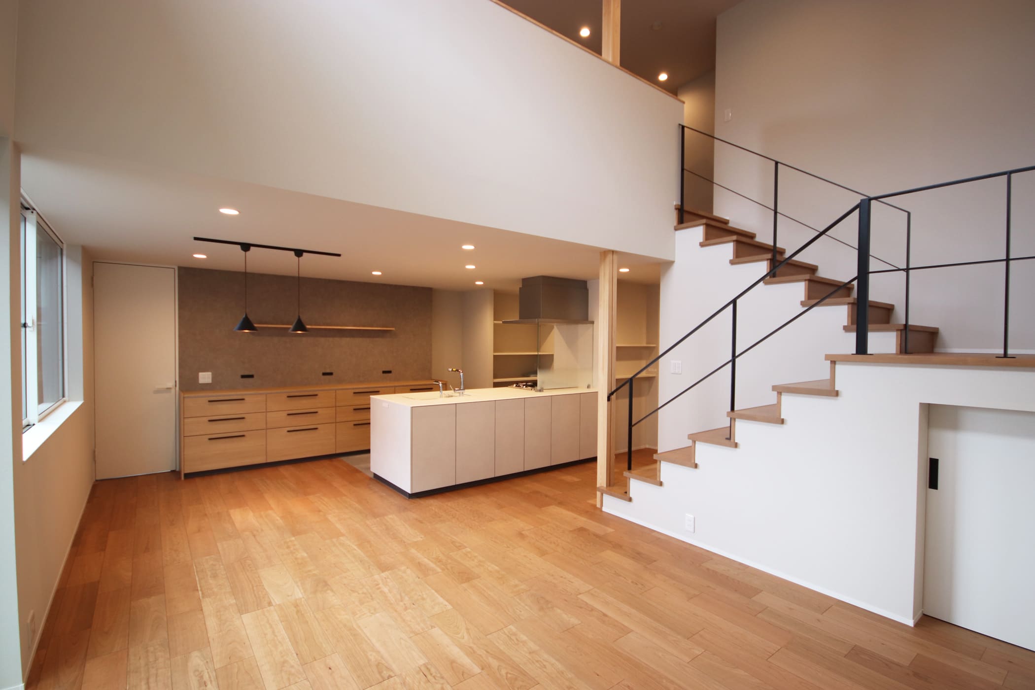 リビングに入ってまず目を奪われるのは、空間のシンボルとなる美しい木の柱と、抜け感のあるアイアン階段。