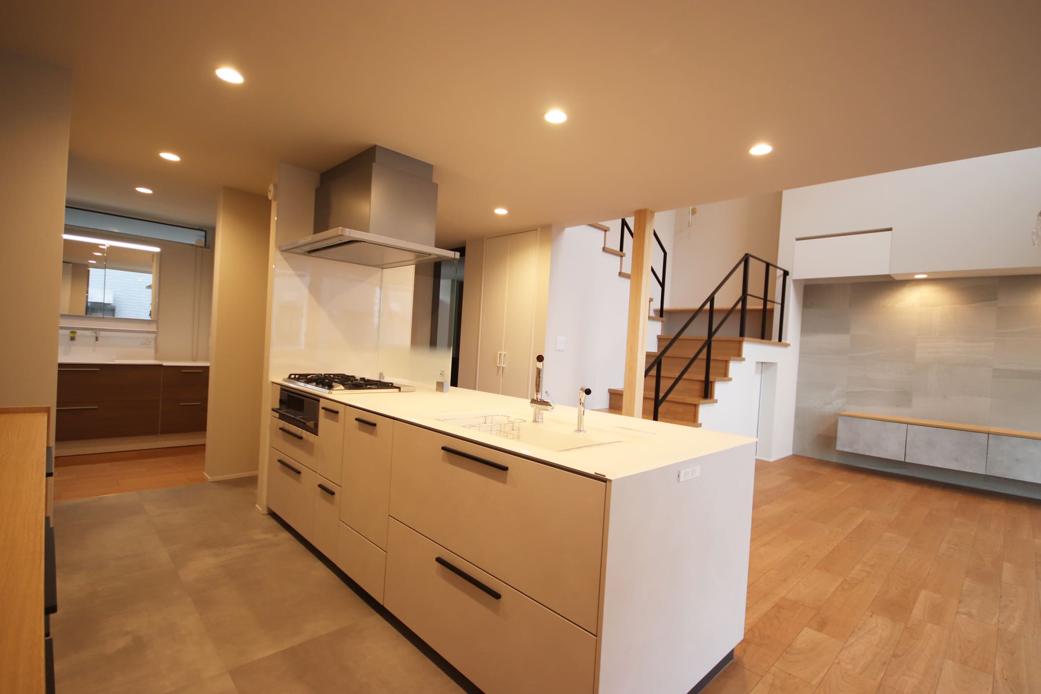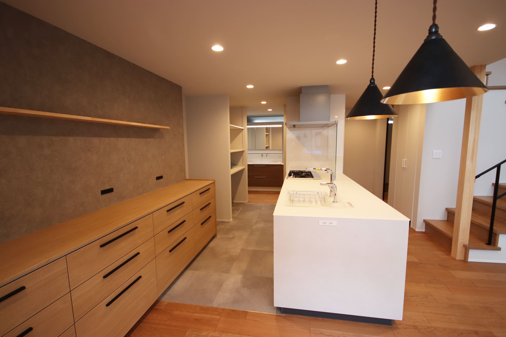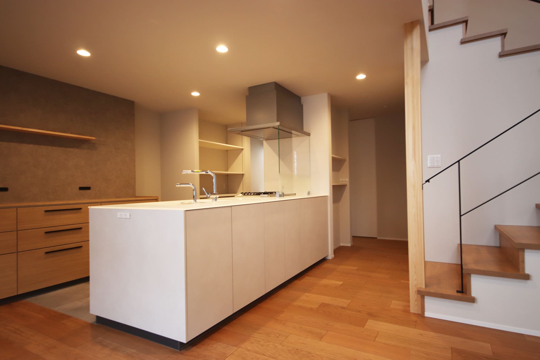 ダークトーンでまとめたキッチンが空間を引き締めつつ、床や柱の木の質感が家族の時間を優しく包み込みます。