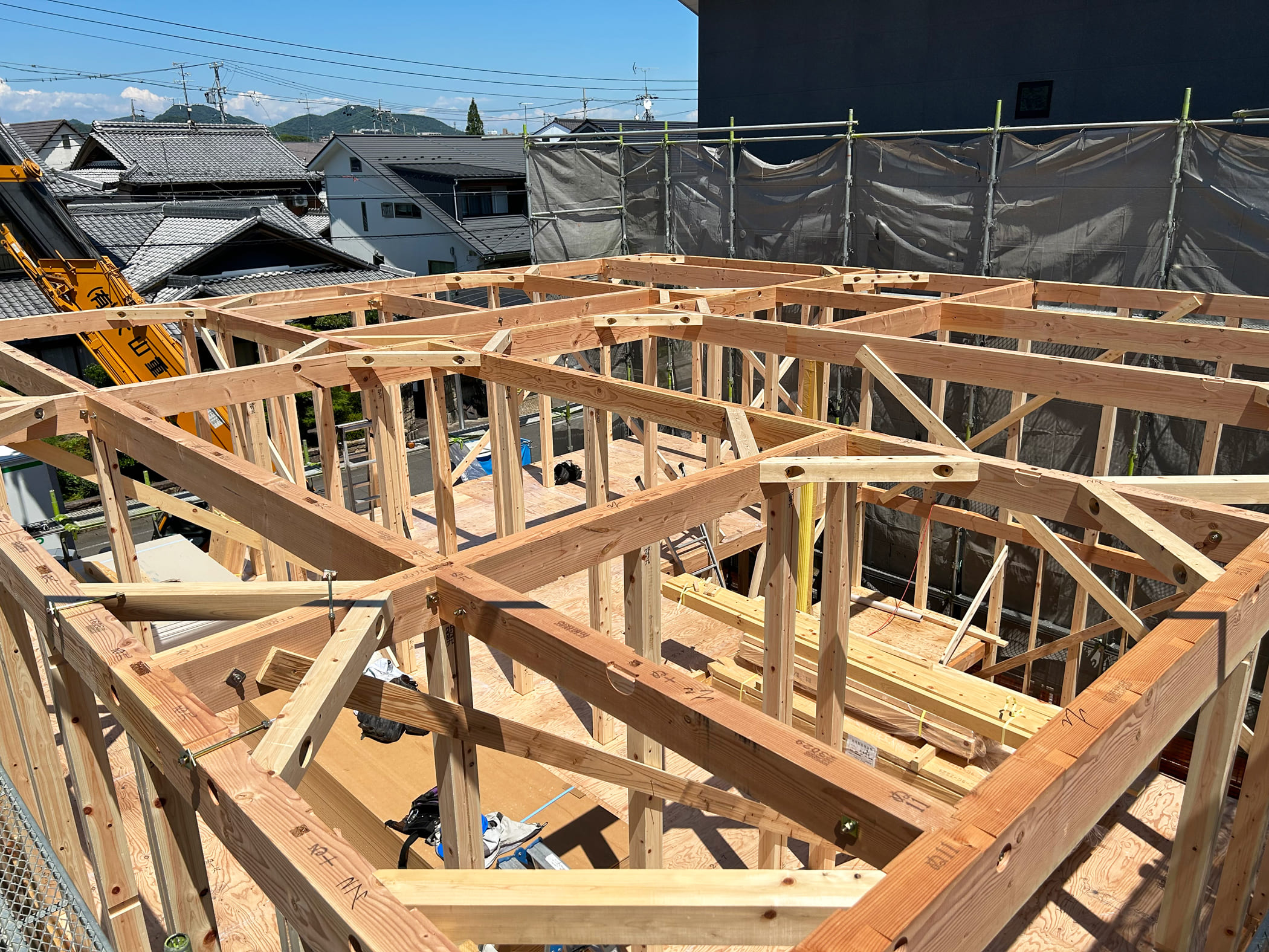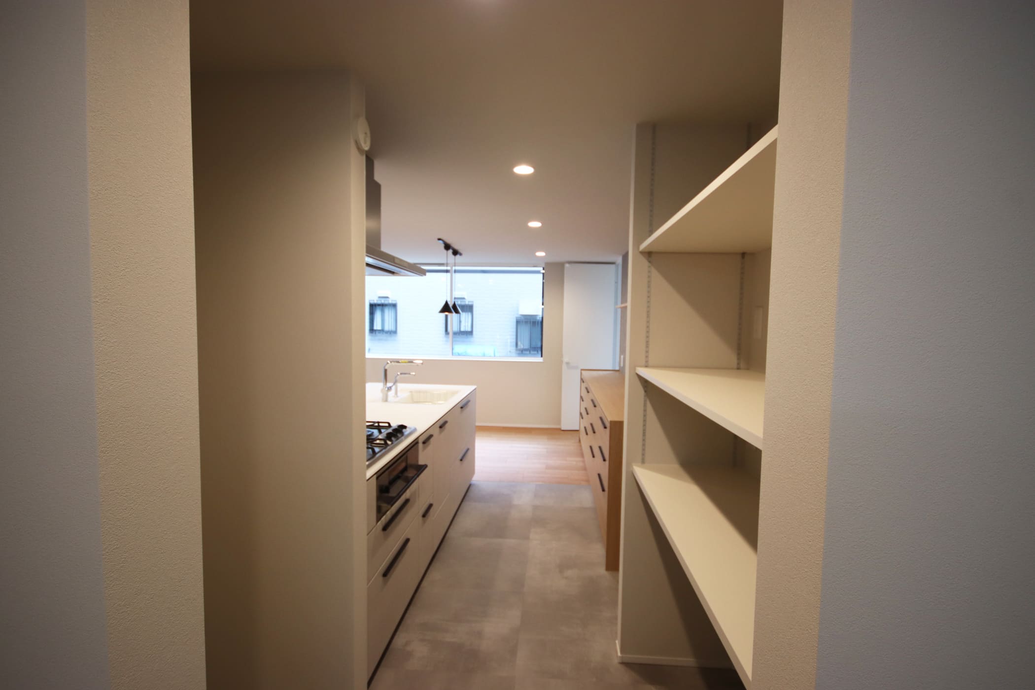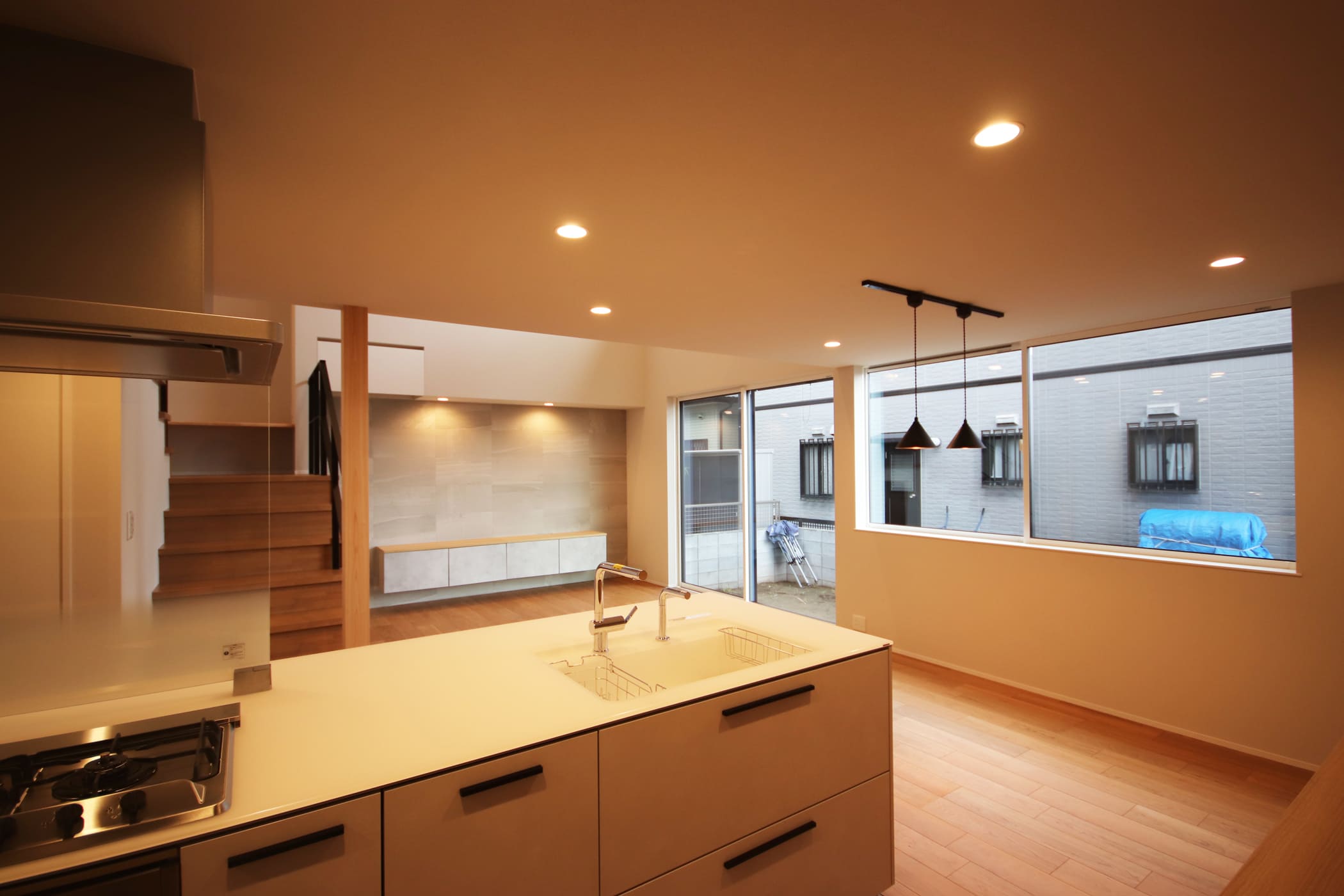 ダークトーンでまとめたキッチンが空間を引き締めつつ、床や柱の木の質感が家族の時間を優しく包み込みます。
