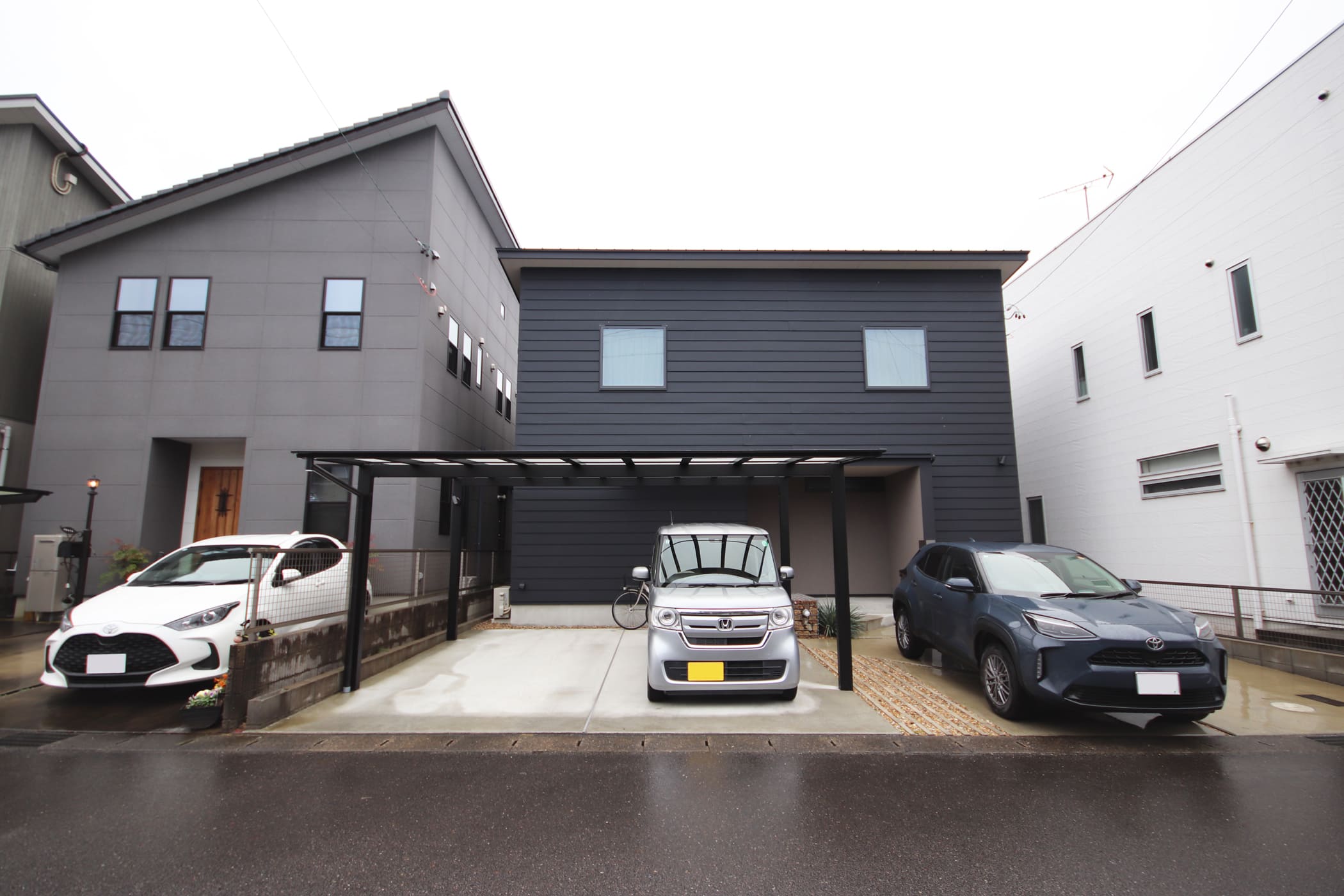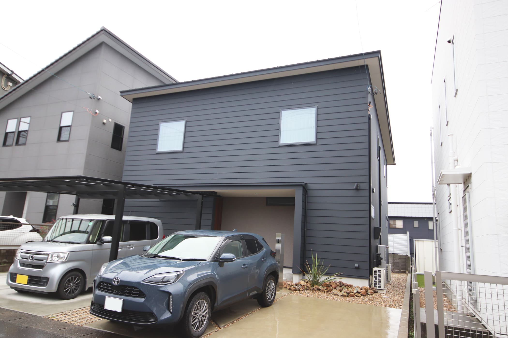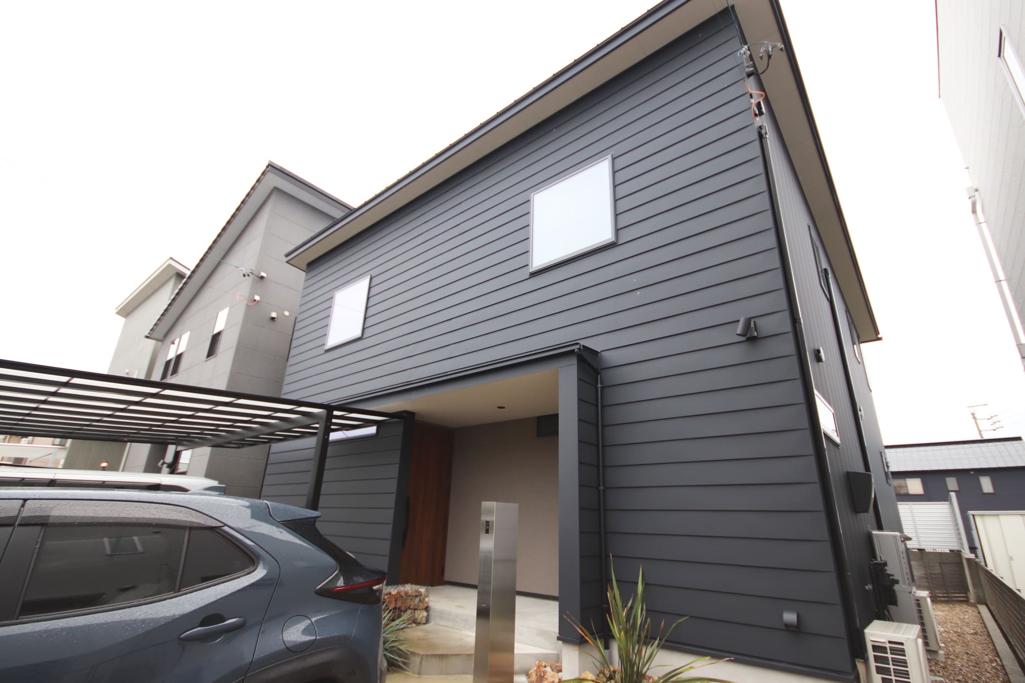 澄み渡る青空にパッと映える、深いネイビーのスクエアな外観。