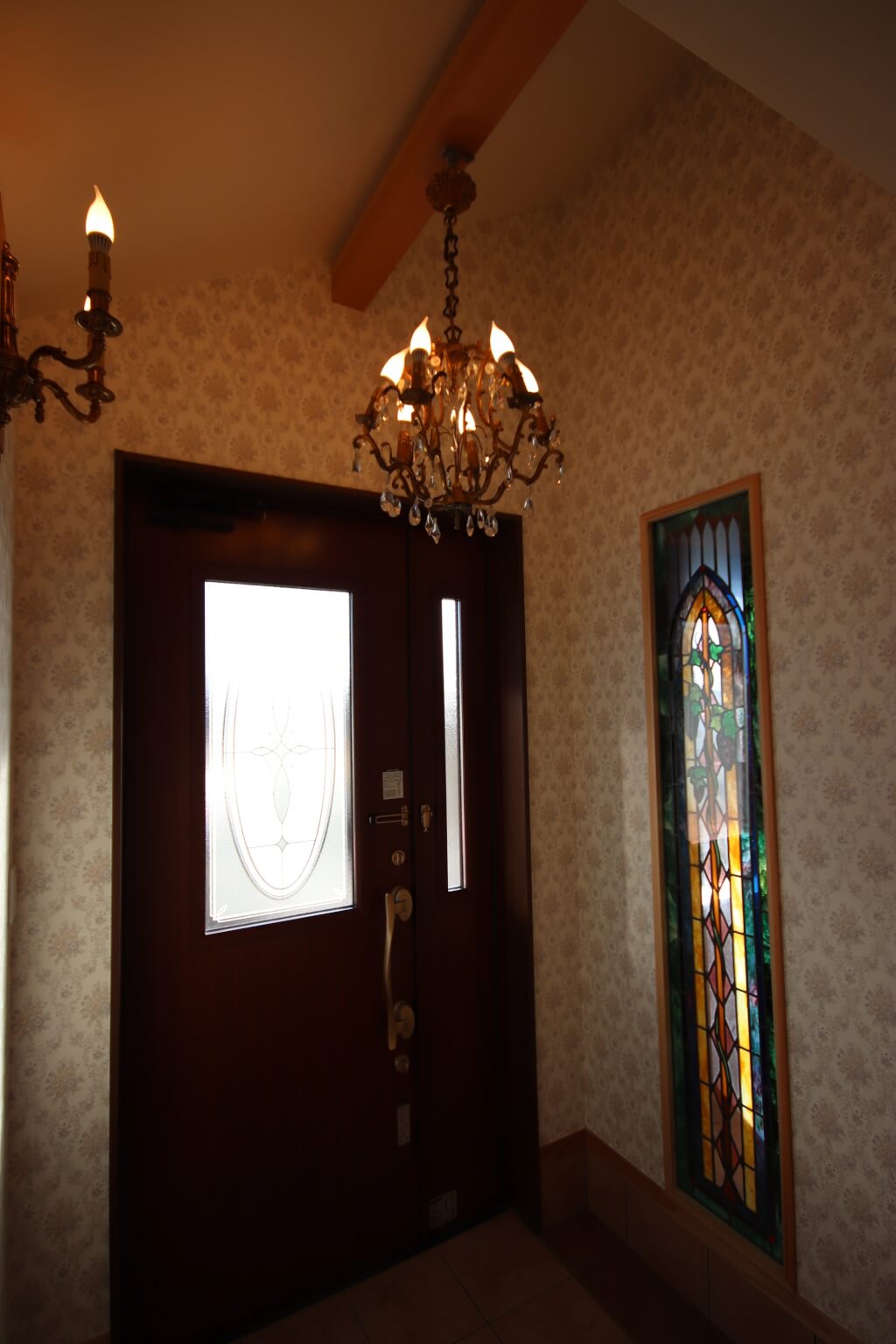 玄関の扉を開けた瞬間、繊細なパターンを描く壁紙と、壁にはめ込まれた美しいステンドグラスが目に飛び込んできます。アンティークなシャンデリアの光が、ステンドグラスの色彩を鮮やかに浮き上がらせ、訪れる人を一瞬で日常から解き放ってくれるような、気品に満ちたおもてなしの空間です。