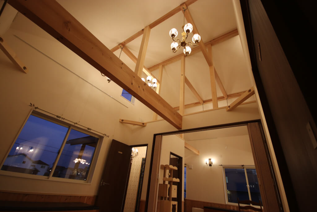 リビングの主役は、屋根の勾配を活かした圧倒的な高さの吹き抜けです。白く清潔感のある壁に、木の呼吸を感じるような梁(はり)が規則正しく並び、その間を優雅なシャンデリアが彩ります。高い位置に設けられた窓からは、時間とともに移ろう空の景色を愉しむことができ、開放感と安らぎが同居する、家族の特等席となっています。